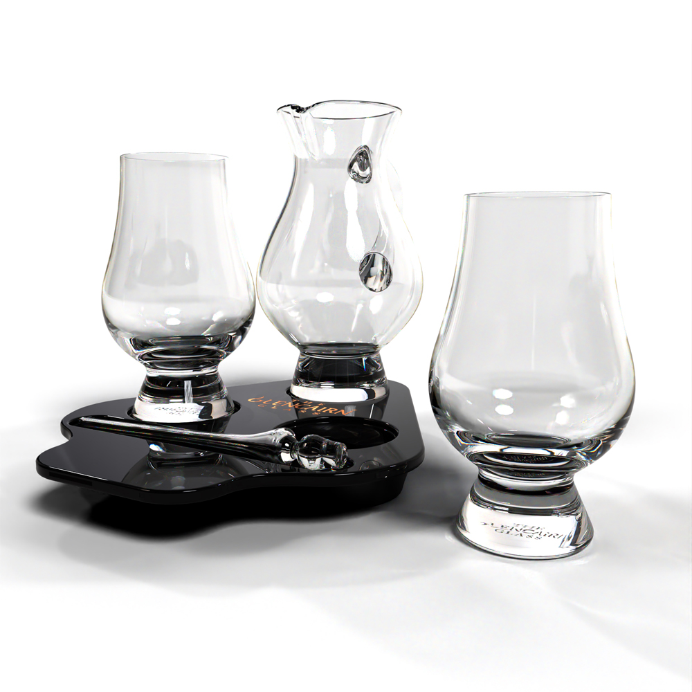 Das Set beinhaltet zwei klassische Glencairn-Gläser, die zum offiziellen Whiskyglas ernannt und in Großbritannien mit dem Queens Award for Innovation ausgezeichnet wurden, eine Pipette, eine Glencairn-Wasserkaraffe aus bleifreiem Kristall und ein Tablett aus poliertem und lackiertem Holz.